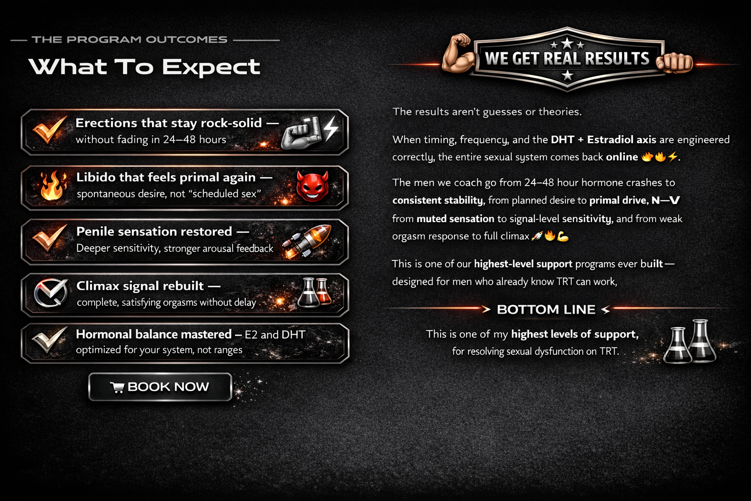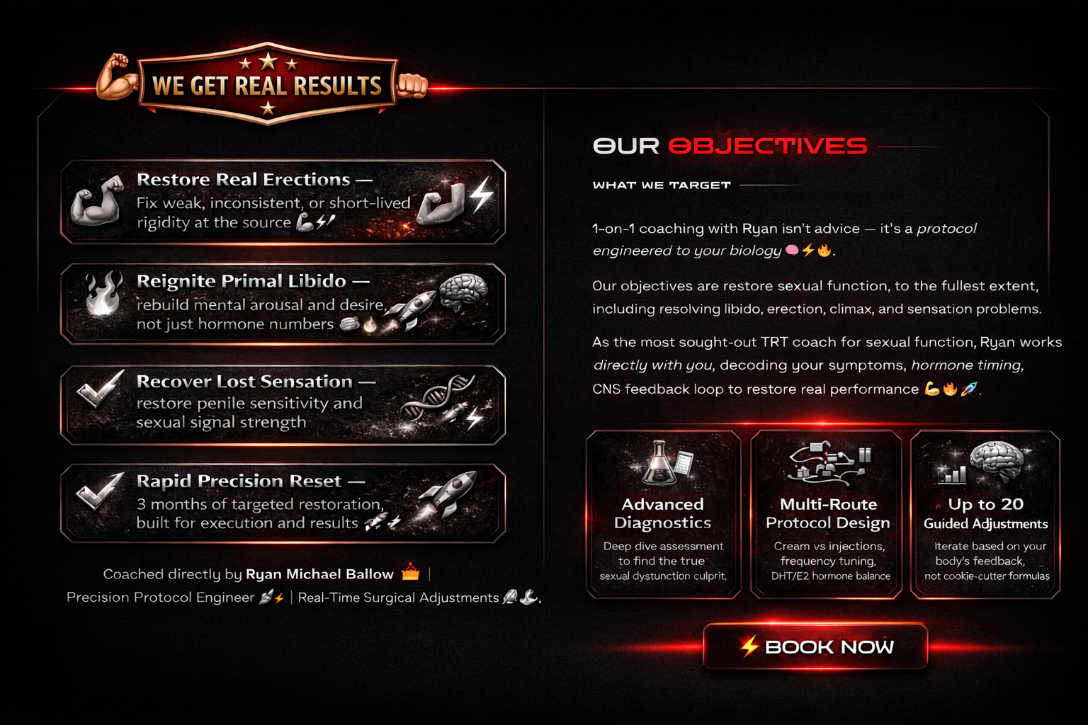 This 1 on 1 TRT coaching program is built for men dealing with unreliable erections, absent libido, muted sensation, and weak or missing climax on TRT. This is a guided, high-iteration program that uses deep fact-finding, history-informed pattern recognition, and up to 20 protocol adjustments to rebuild sexual function and performance the right way.