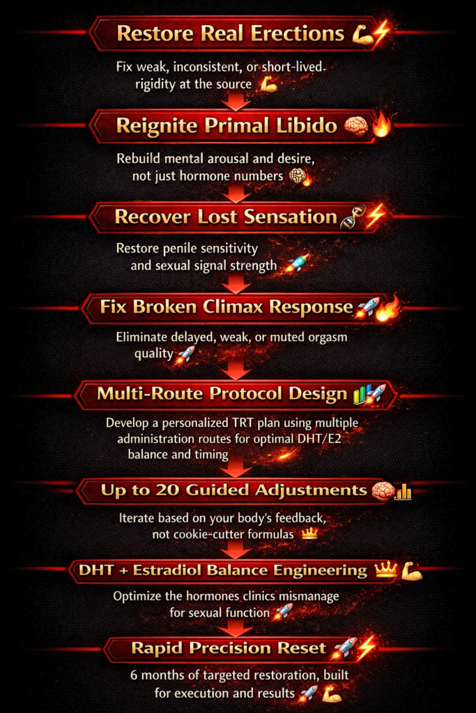 The 6-Month Advanced TRT Sexual Function Restoration program is built for men dealing with persistent erection failure, flat or inconsistent libido, loss of genital sensation, delayed or weak climax, or layered dysfunction from prior protocols.