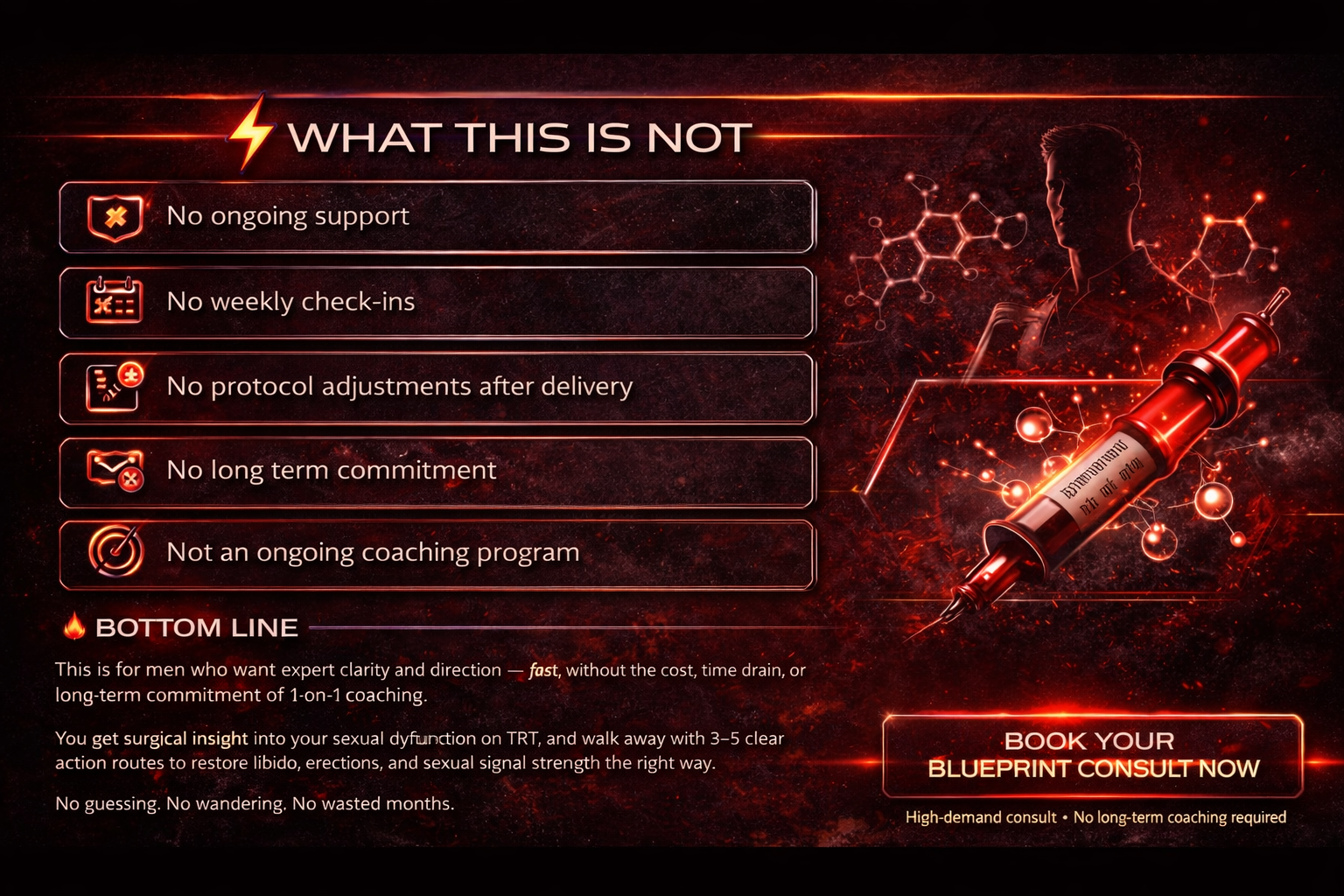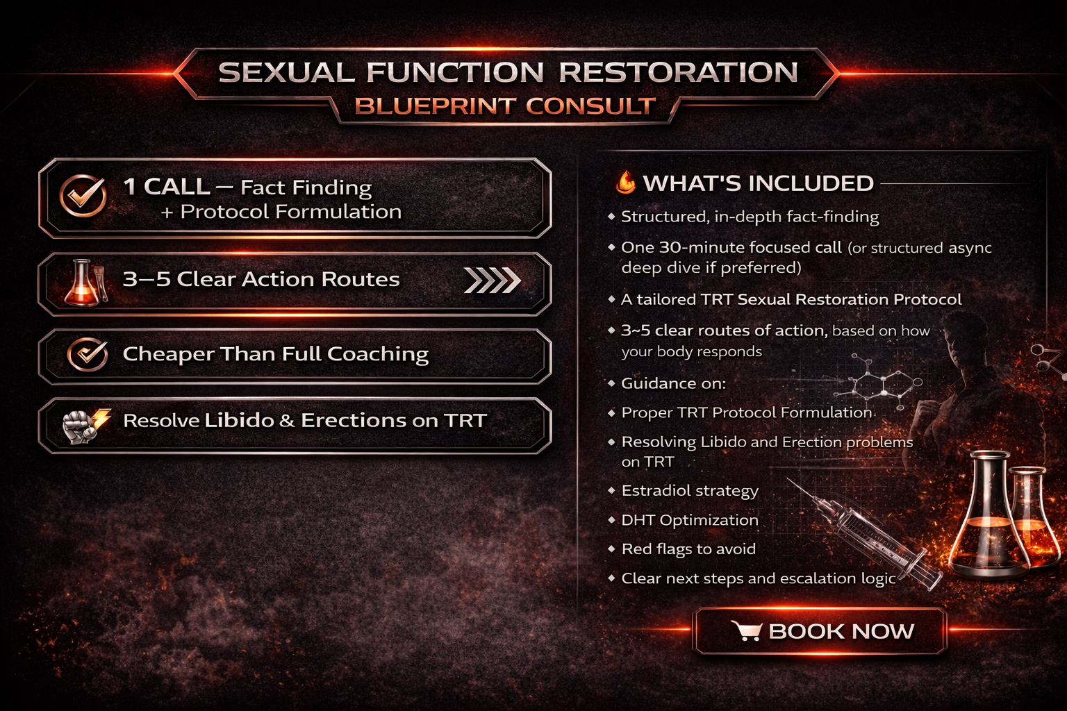 The TRT Sexual Function Blueprint is a single-session expert deep dive that extracts the exact logic used to restore erections, libido, sensation, and climax when common protocols fail. If you’re tired of not being able to dial in libido and erections on TRT this is the consult that resolves that, with 3–5 strategic action paths you can execute immediately. No fluff. No guessing. Just clarity and next moves.